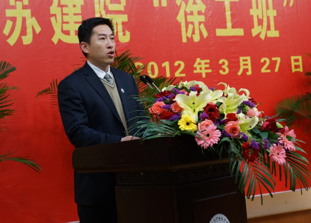 校企合作办公室主任许能生主持典礼 机电学院党总支书记潘峰发言 徐工班”学生代表王乾发言